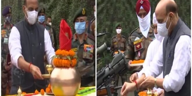 राजनाथ सिंह ने जवानों के साथ की शस्त्र पूजा, कहा- भारत एक इंच जमीन भी किसी दूसरे के हाथों में जाने नहीं देगा