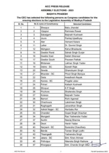 भोपाल। कांग्रेस ने मध्य प्रदेश विधानसभा चुनाव के लिए अपने प्रत्याशियों को पहली सूची जारी कर दी है। इस लिस्ट में 230 विधानसभा सीटो में से 144 के लिए उम्मीदवारों का एलान किया गया है। कमलनाथ छिंदवाड़ा से चुनाव लडे़ंगे।
