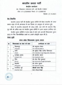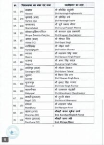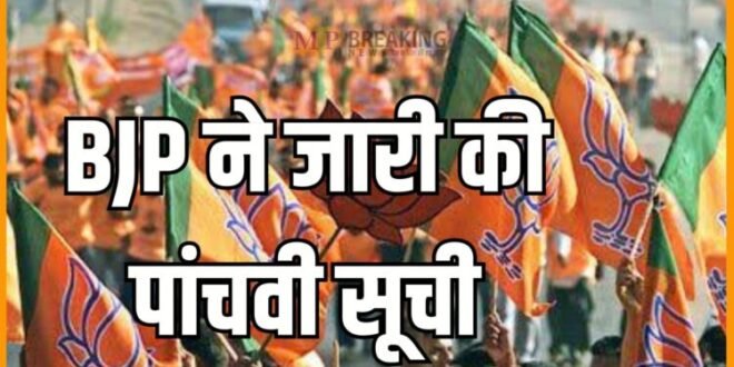 बीजेपी ने आज अपनी पांचवीं लिस्ट जारी कर दी है। इसमें 70 उम्मीदवारों के नामों का ऐलान किया गया है।कांग्रेस प्रत्याशियों की पहली सूची जारी होने के बाद अब मध्य प्रदेश विधानसभा चुनाव के लिए बीजेपी ने अपनी पांचवी लिस्ट जारी कर दी है। इस लिस्ट में कुल 70 उम्मीदवारों के नाम शामिल किए गए हैं।