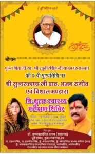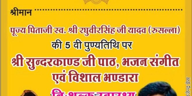 पूर्व सांसद डॉक्टर के पी यादव के पिता एवं पूर्व जिला पंचायत अध्यक्ष स्वर्गीय रघुवीर सिंह रुसल्ला की स्मृति में सुंदरकांड पाठ,भजन-संगीत एवं विशाल भंडारे का आयोजन