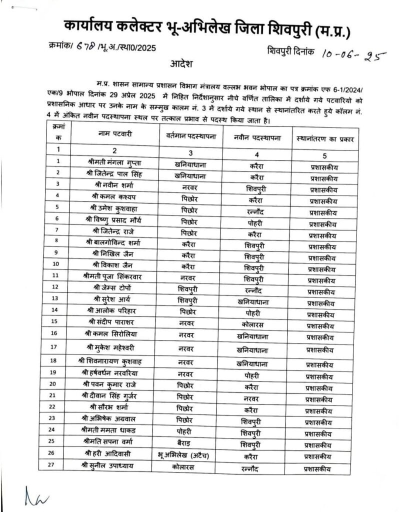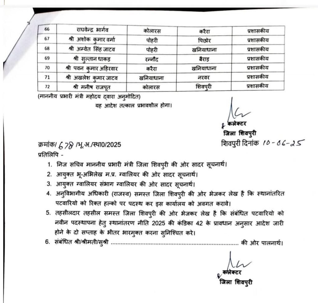 शिवपुरी। जिले के राजस्व महकमे में एक बार फिर बड़ा प्रशासनिक बदलाव देखने को मिला है। कलेक्टर कार्यालय, भू-अभिलेख शाखा द्वारा जारी आदेश क्रमांक 678/भू.अ./स्था./2025 दिनांक 10 जून 2025 के तहत 70 से अधिक पटवारियों का स्थानांतरण कर दिया गया है। यह कार्रवाई म.प्र. शासन के सामान्य प्रशासन विभाग, वल्लभ भवन भोपाल के निर्देशानुसार की गई है।